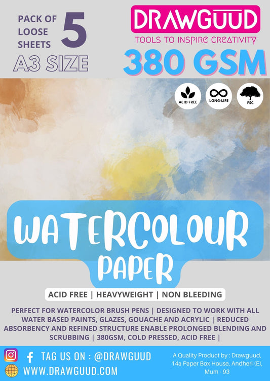 DRAWGUUD PACK OF 1 380 GSM WATERCOLOUR PAPER FOR PAINTING, LOOSE SHEETS